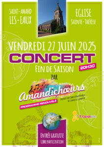 Actualités Vous souhaitez être informé régulièrement de nos actualités. Cliquez sur le bouton à droite A venir : Week-end Accord’âges. En attendant de lire plus d’informations sur notre site vous pouvez obtenir les renseignements sur le site A Coeur Joie NOTRE PROCHAIN CONCERT : Amandichoeurs vous invite chaleureusement Concert de Sainte Cécile le dimanche 23 novembre à 16h salle Jean Ferrat, derrière le Théâtre des sources, à St Amand les eaux. Venez nombreux célébrer la musique et le plaisir de chanter ensemble ! NOS CONCERTS PRECEDENTS : vendredi 27 juin à 20h30 CONCERT DE FIN DE SAISON à l'église Ste Thérèse, route de Lille à St Amand Vendredi 25 avril à 20h30 à l'église Ste Thérèse à st Amand